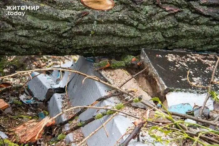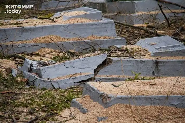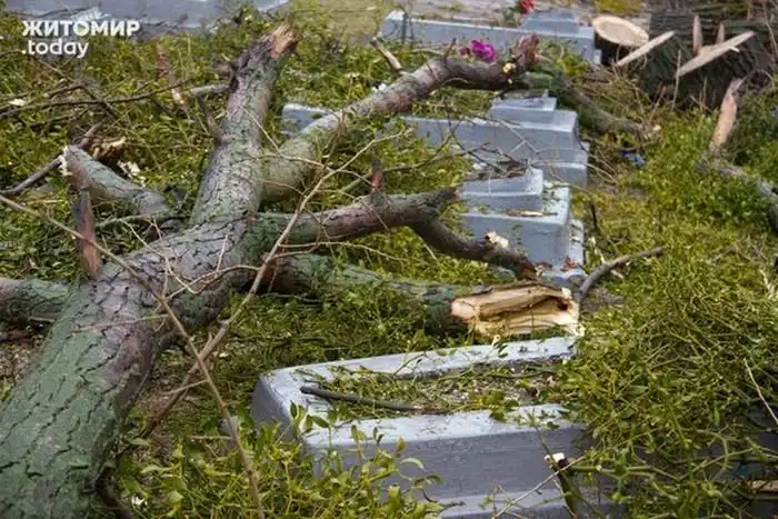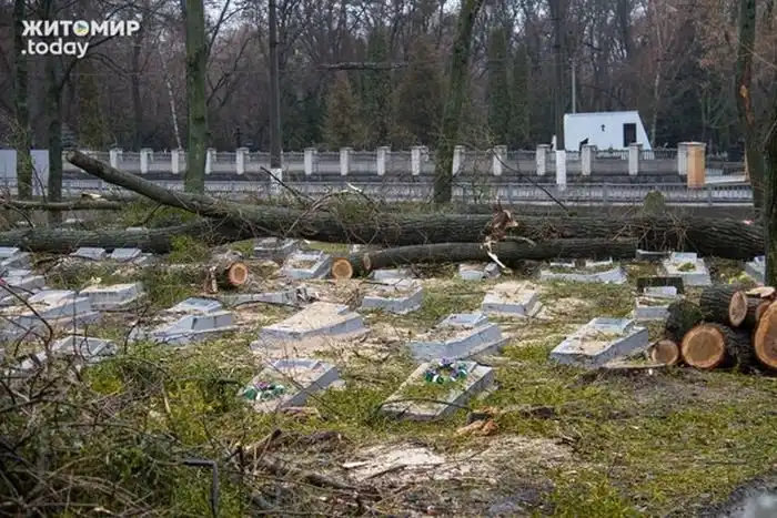 В Житомире коммунальщики разрушили десятки надгробий на кладбище советских солдат, погибших во время Великой Отечественной войны. Оказывается, это последствия работы сотрудников «Специализированного комбината коммунально-бытового обслуживания», занимавшихся обрезкой деревьев. Поваленные деревья, которые еще некоторые время лежали на могилах, падали прямо на надгробия, ломая их. Только после разгоревшегося скандала местные власти пообещали все отремонтировать.