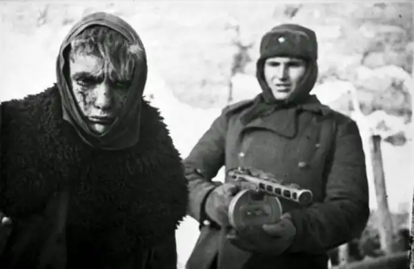 Советский солдат сопровождает германского военнопленного после победы в битве за Сталинград