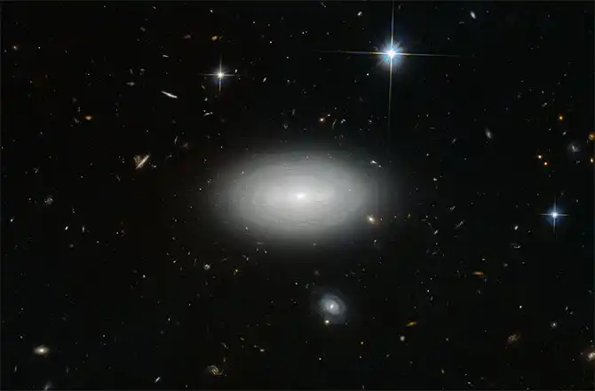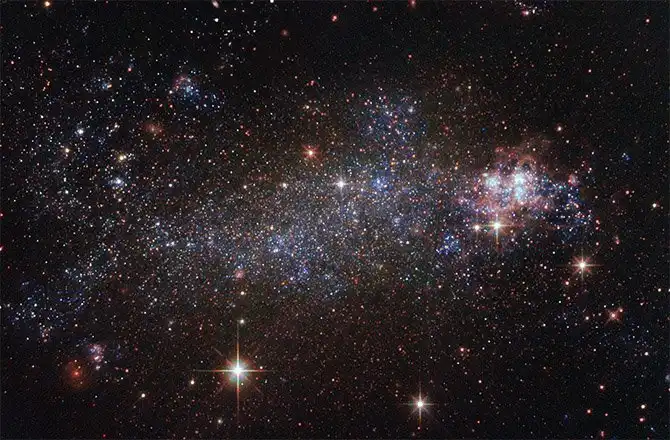 Галактика, безусловно, предмет Хаббла, и эти последние 12 месяцев не было по-другому. Здесь показана, одна из таких галактик, но её трудно классифицировать; она не эллиптическая или спиральная, она "иррегулярная". И хотя они, кажется, не соответствуют особенным правилам построения, иррегулярные галактики по-прежнему красивы, как изображенная на этом снимке.