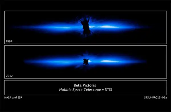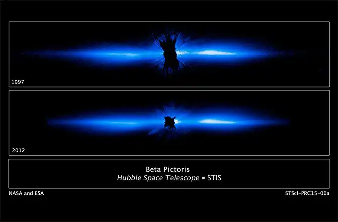 Хаббл очень хорошо себя показал, в открытии планет вращающихся вокруг других звезд, и звездных дисков от которых они произошли. В новых наблюдениях протопланетного диска молодой звезды Бета Пикторис, странное движение обнаружено в дисковой пыли, выявив невидимую гигантскую экзопланету.