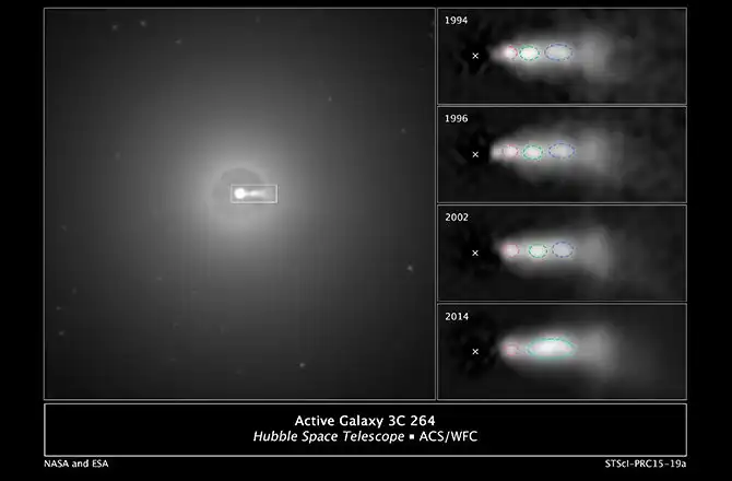 Хотя Хаббл технически не может видеть черные дыры, он может увидеть их влияние на локальное пространство. И в этом случае, космический телескоп увидел релятивистские удары в потоке материала вызванного сверхмассивной черной дырой находящейся в 260 миллионах световых лет от Земли.