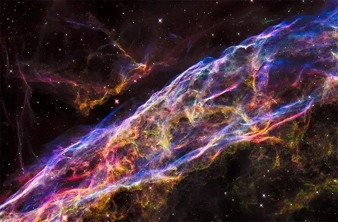 В новых изображениях переданных Хабблом, были выявлены некоторые потрясающие детали туманности впоследствии сверхновой звезды. Здесь показана остывающая плазма в туманности Вуаль, остаток от звезды взорвавшейся 8000 лет назад.
