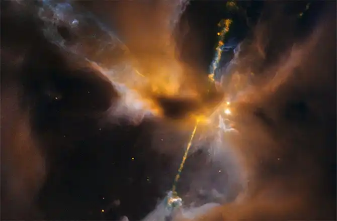 Чтобы не остаться в стороне от лихорадки 2015 года в отношении "Звёздных Войн Эпизод VII: Пробуждение силы" в декабре, Хаббл представил очень научно-фантастическое изображение объекта Хербига-Аро - в основном горячей молодой звезды. Этот частичный пример, кажется, проявляет свой дух Звездных Войн, производя двух-клинковый световой меч.