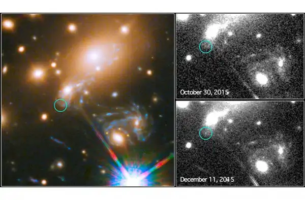 Впервые обнаруженная в 2014 году, эта древняя сверхновая звезда появилась ещё три раза, в разных местах галактического скопления. Эта особенность пространства-времени - гравитационная линза - может вызвать лучи света путешествовавшие разными путями вокруг массивных объектов. Иногда, как показал Хаббл, хотя все они происходят из одного источника, 4 световые точки могут появиться в виде креста, названного "Крест Эйнштейна".
