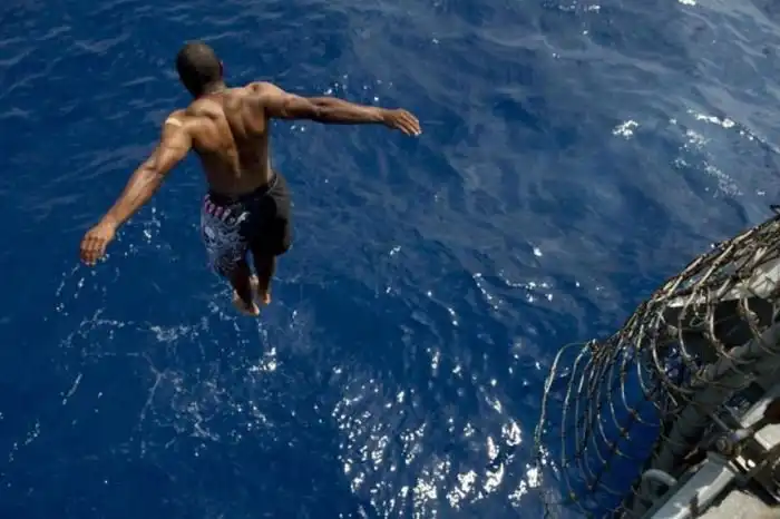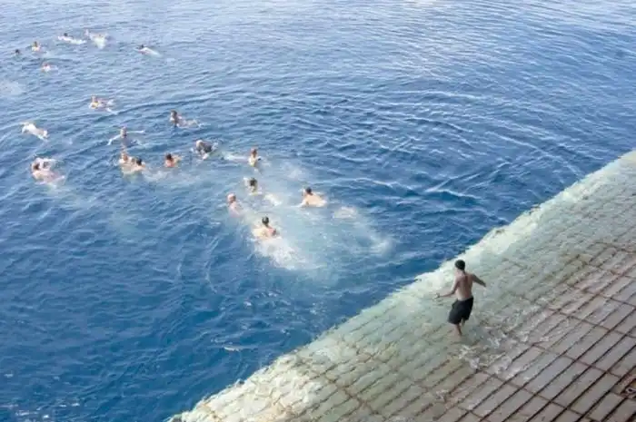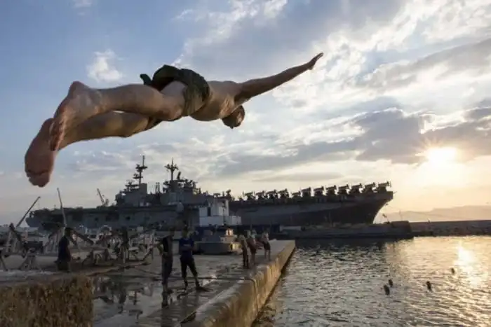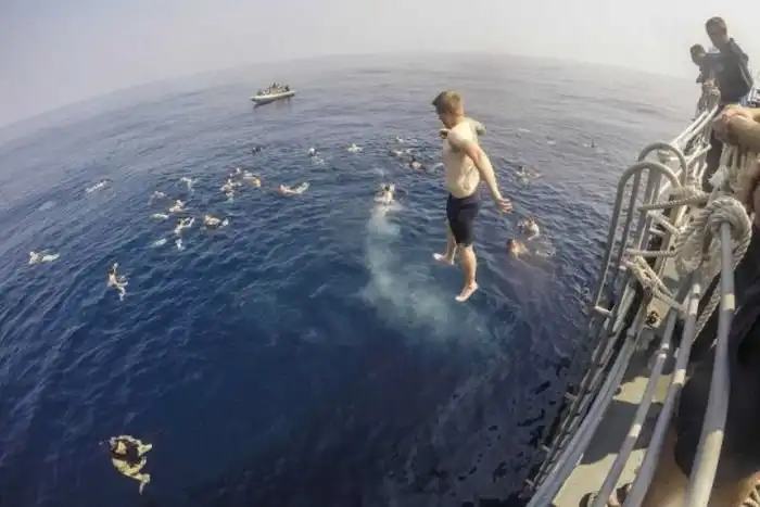В моменты непродолжительных стоянок в открытом море американским морякам и морским пехотинцам разрешается немного поплавать. Моряки прыгают в воду и плавают возле кораблей, пока их товарищи следят за тем, чтобы к судам не приблизились акулы.