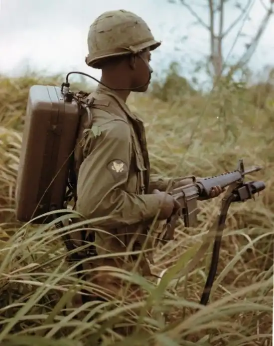 Американский солдат с детектором живой силы противника E63 (XM–2) в полевых условиях, 1967 год, Южный Вьетнам