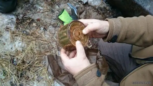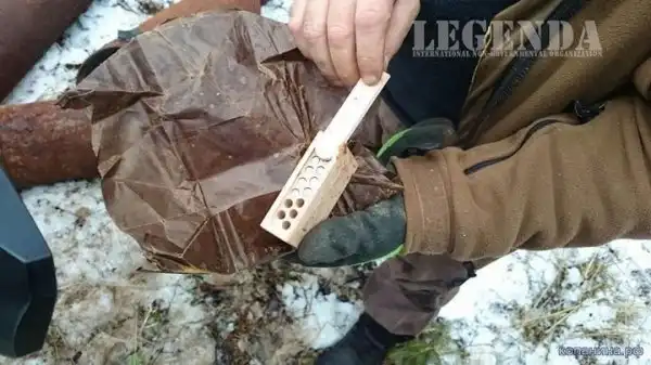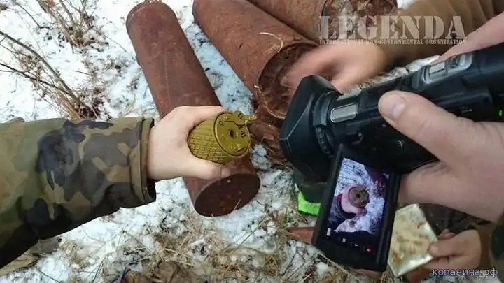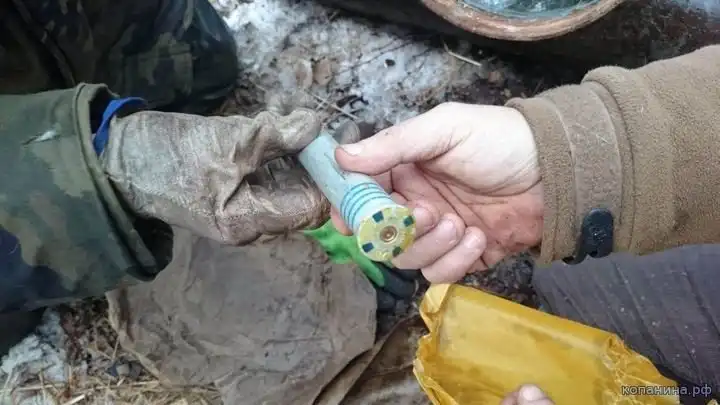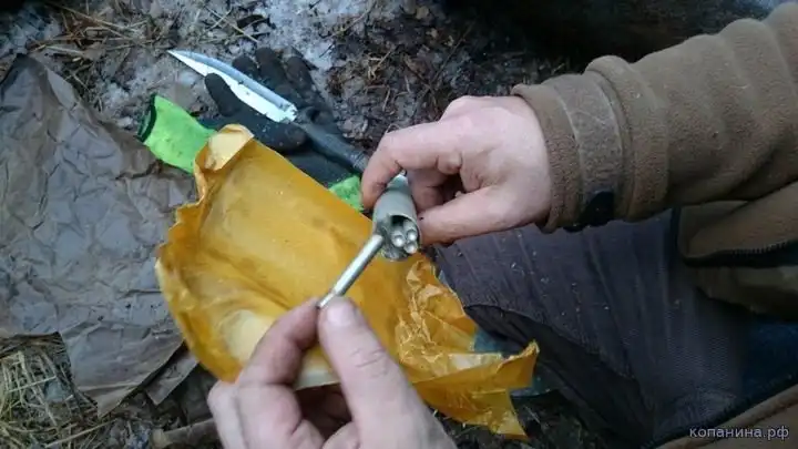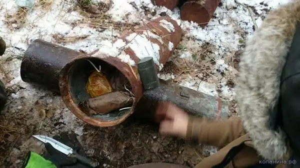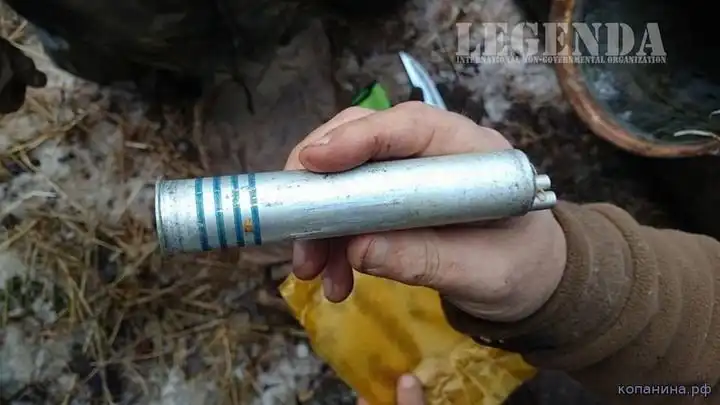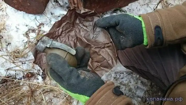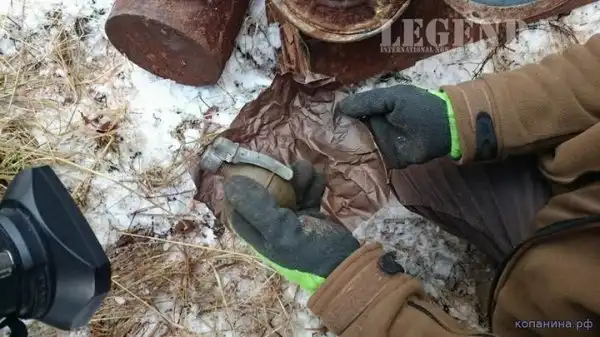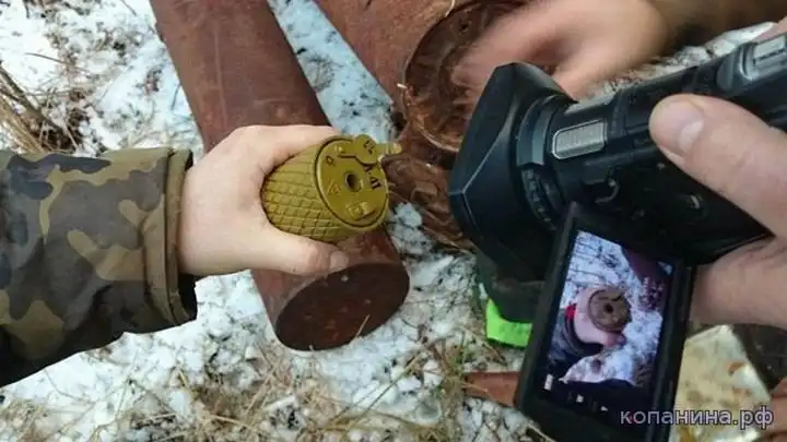 Ручная граната РГД-33. Поисковик демонстрирует пустое запальное гнездо