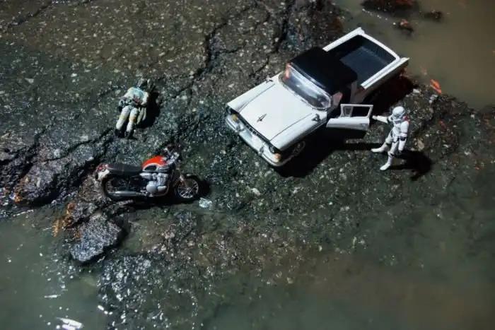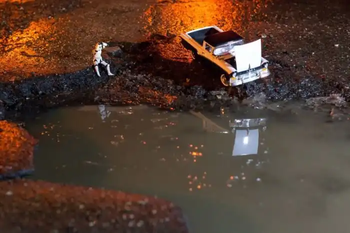 Фотографы Александр Шадрин и Григорий Ляпин решили обратить внимание властей Самары на плохие дороги в городе и превратили ямы в арт-объекты. На пересечении улиц Советской армии и Дыбенко прямо посреди дороги они устроили инсталляцию, частью которой стали и ямы в асфальте. Вокруг заполненных водой ям расположились фигурки солдатиков и игрушечные автомобили, в итоге получилось некое подобие водоема, у которого идет бой.