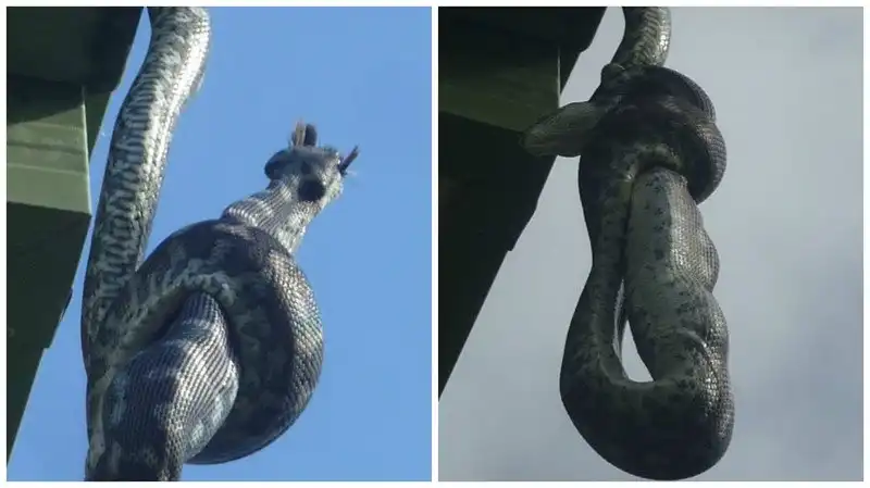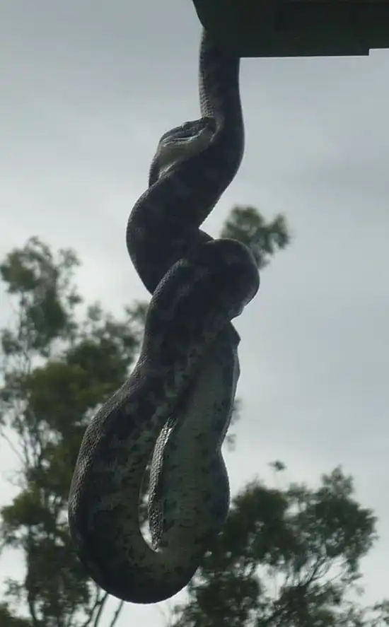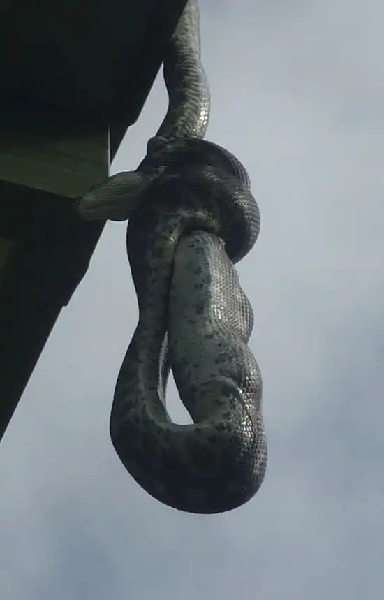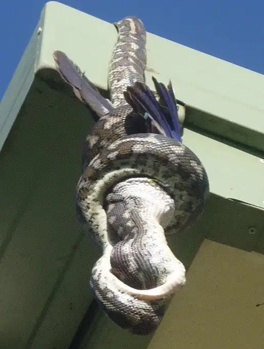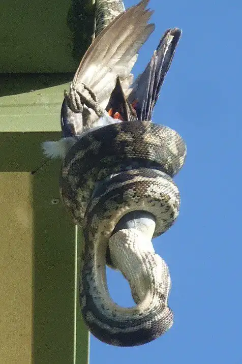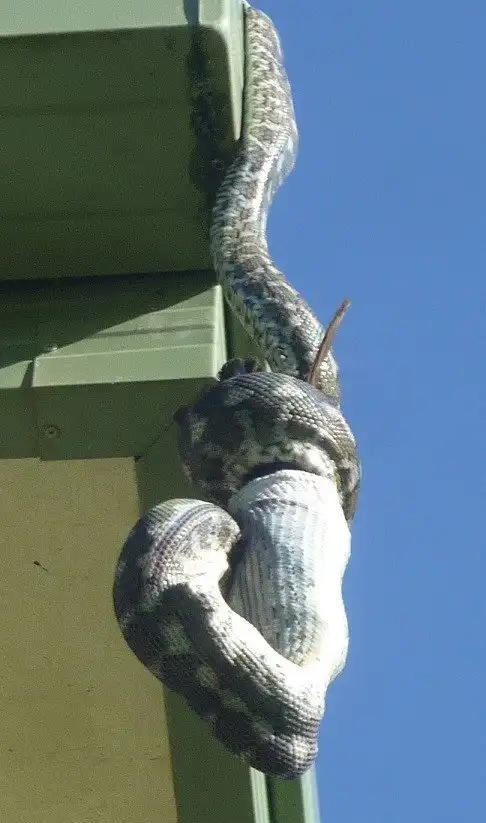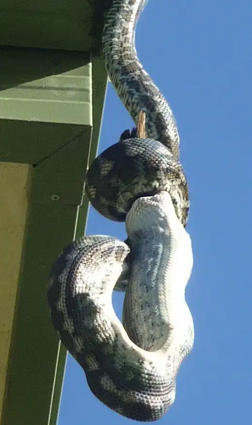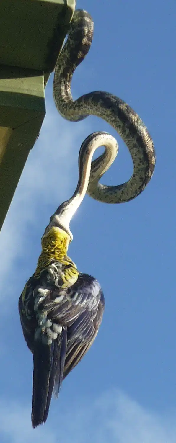 Проснувшись сегодня утром в суматохе, весело болтая, мы вышли из дома и вдруг... столкнулись с питоном прямо на пороге своего жилища. Он был занят поеданием бледноголовой розеллы на крыше.