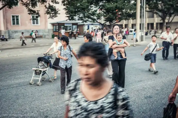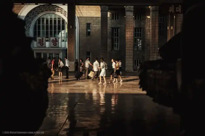 Прибытие в Пхеньян. Фотографу даже показалось, что эти одетые с изысканностью путешественники оказались там неслучайно: в тот день по расписанию больше не было поездов, только тот, на котором он приехал.