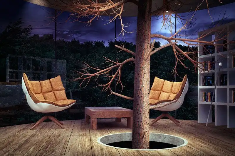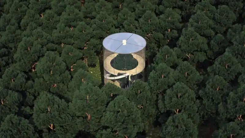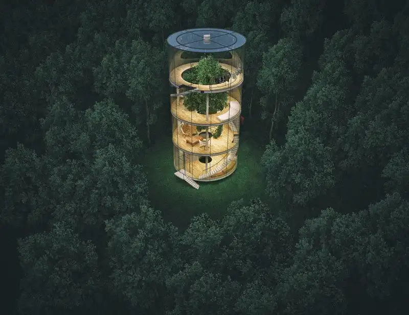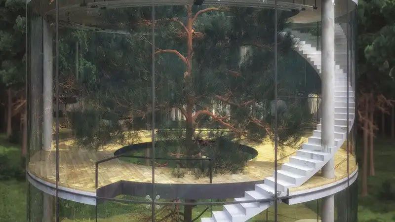 Архитектор и дизайнер из Казахстана Айбек Алмасов точно знает смысл русской поговорки о том, что нельзя бросаться камнями в стеклянном доме: именно стеклянный дом он себе и построил, причём этот дом образует цилиндр вокруг высокого дерева в лесу. Главная цель проекта, задуманного ещё в 2013 году, по словам Алмасова, - разработка альтернативы шумной городской жизни и сочетание современного дизайна и красоты природы.
