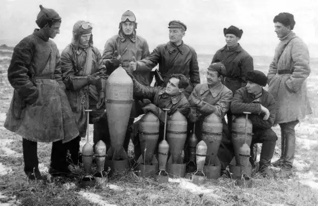 Советские авиаторы ВВС ОДВА позируют на аэродроме с фугасными бомбами АФ-32, АФ-82 (одна штука) и осколочными ОФ-8 с штыревыми взрывателями для подрыва над землей. Вскоре эти бомбы были сброшены на Маньчжурию. 1929 год