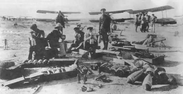 На аэродроме 25-го советского разведывательного авиаотряда в районе станции Каган (Новая Бухара). авиаторы готовят боеприпасы для предстоящей бомбардировки дворца бухарского эмира, август 1920 года