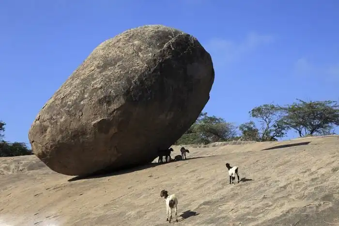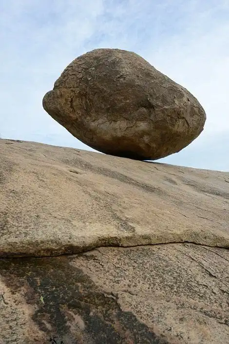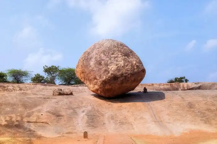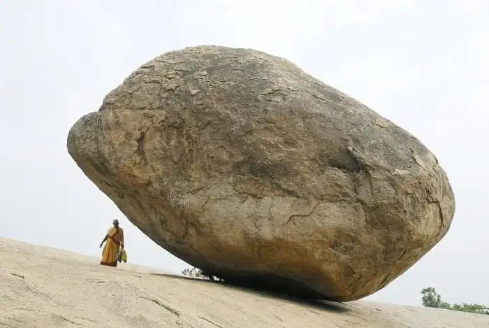 Огромный валун весом 250 тонн вот уже 1300 лет находится на склоне одного из холмов индийского города Махабалипурам. Камень, получивший название «Масляный шар Кришны» или «Камень Небесного Божества», привлекает к себе множество паломников и туристов со всего мира. Накрененный под углом в 45 градусов, камень опирается на небольшой скользкий участок, но при этом остается на месте. Несмотря на то, что валун бросает вызов всем известным законам физики, все предпринимавшиеся ранее попытки сдвинуть его с места заканчивались провалом.