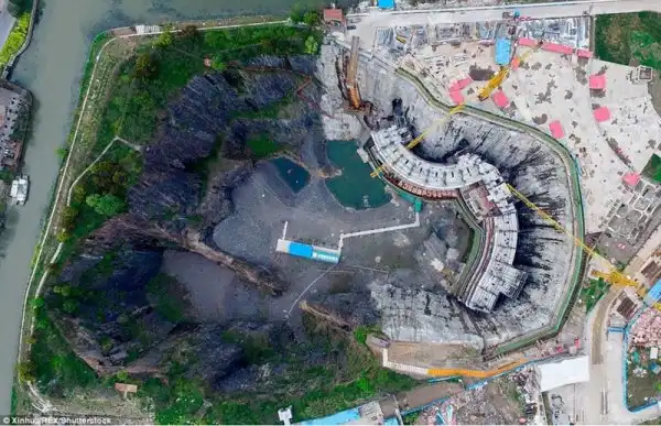 Еще в 2013 году было объявлено о планах строительства в Китае необычной гостиницы. 19-этажное здание должно было быть пристроено к скалистой стене старой заброшенной каменоломни. Удивительно, но фантастический проект действительно начал реализовываться, как убедительно демонстрируют последние снимки агентства «Синьхуа».