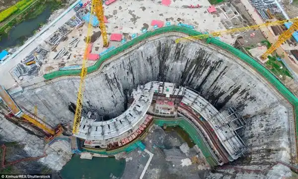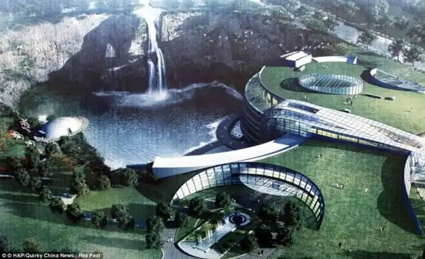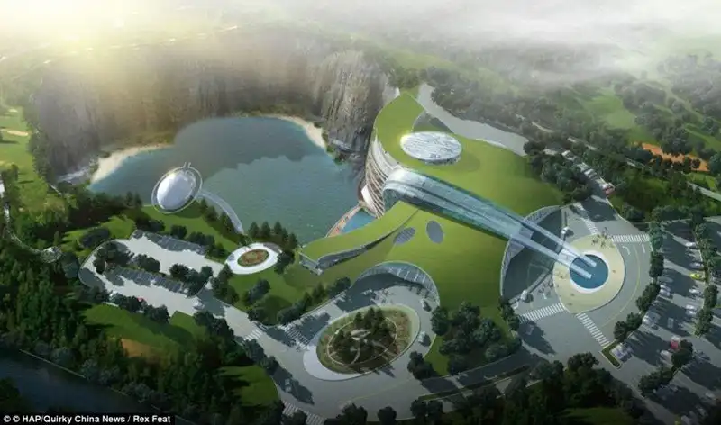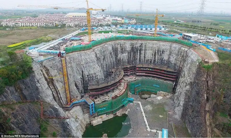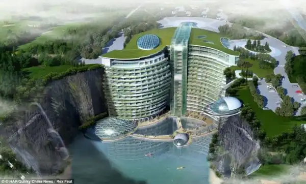Новый отель InterContinental Shimao должен появиться в китайском районе Сунцзян, в 50 километрах от Шанхая. Здание, спроектированное британской компанией Atkins, расположится в старой неиспользуемой каменоломне глубиной 100 метров, причем часть внутренних помещений разместится в глубине скалы, в искусственных пещерах. Почти все этажи гостиницы будут располагаться ниже уровня земли.