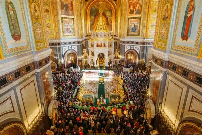Вид с хоров. Съемка проводилась во время Патриаршего богослужения 1й недели Великого поста. Особую торжественность службе придал тот факт, что она проходила на 40-ю годовщину Архиерейской хиротонии Святейшего Патриарха Московского и всея Руси Кирилла.