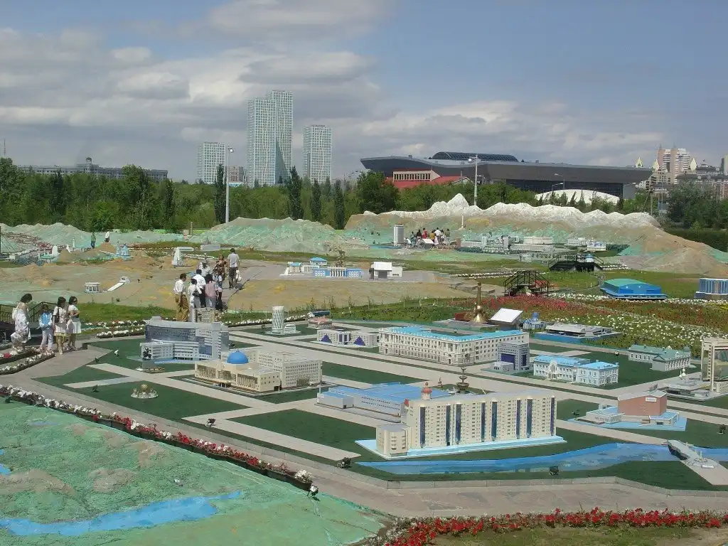 Ну и, конечно, как же без достопримечательностей архитектурных. Тут Казахстану тоже есть что вам предложить. И начнём с уникального музея под открытым небом, который представляет собой настоящую страну в миниатюре. Здесь представлены городские достопримечательности и исторические памятники всех городов и регионов государства. Площадь карты — 1,7 гектар. Здесь расположены все 14 областей Казахстана и два главнейших города — Астана и Алматы.