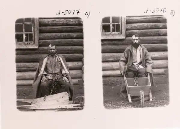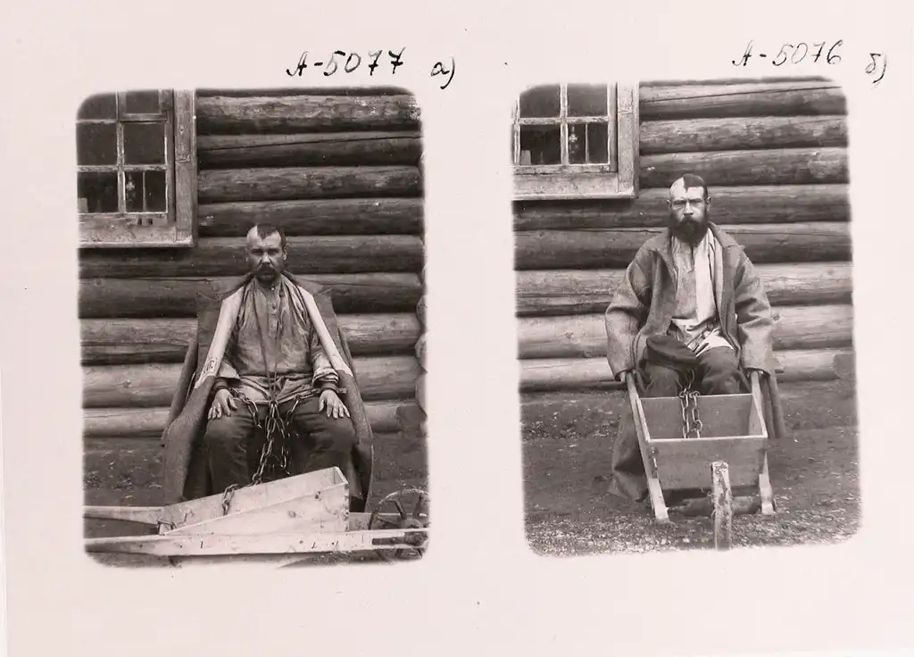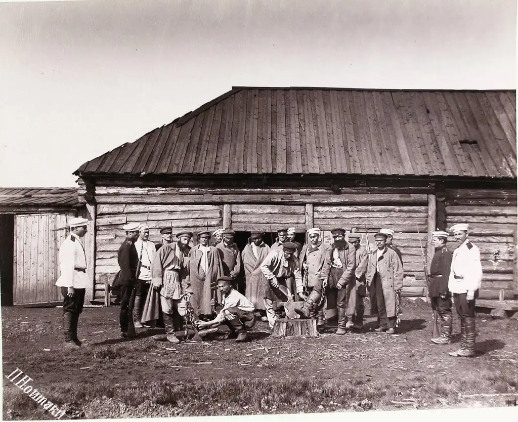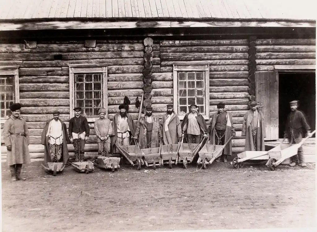 Ссыльно-каторжные, прикованные к тачкам, у здания Воеводской Дуйской тюрьмы.