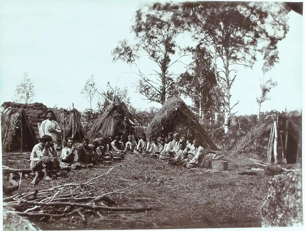 Обед ссыльно-каторжных в стане во время работ по проведению дороги.