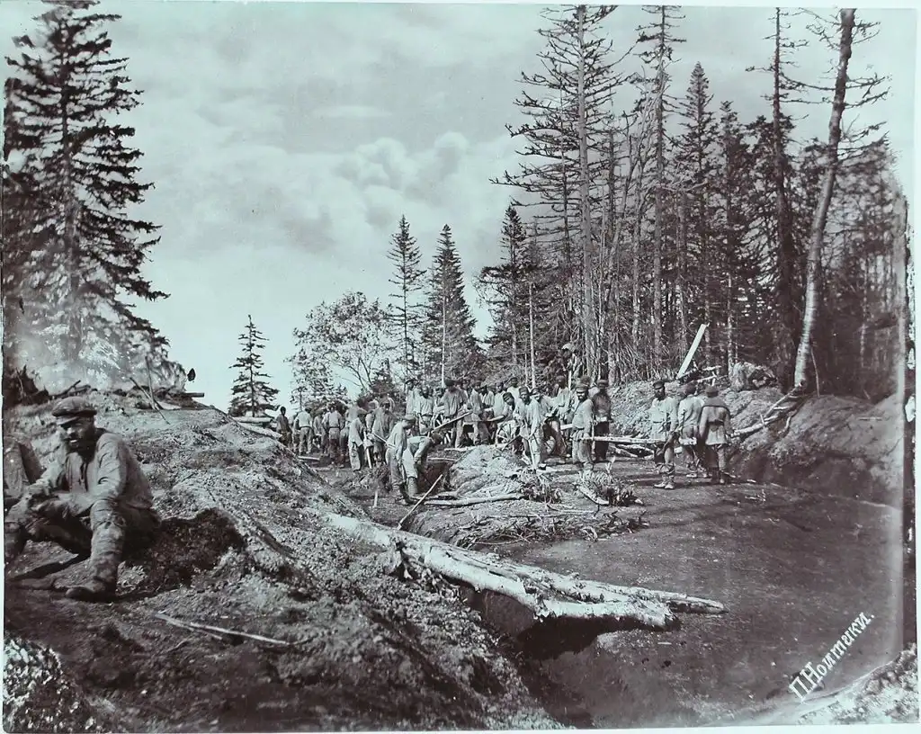 Ссыльно-каторжные прокладывают дорогу через горный хребет.