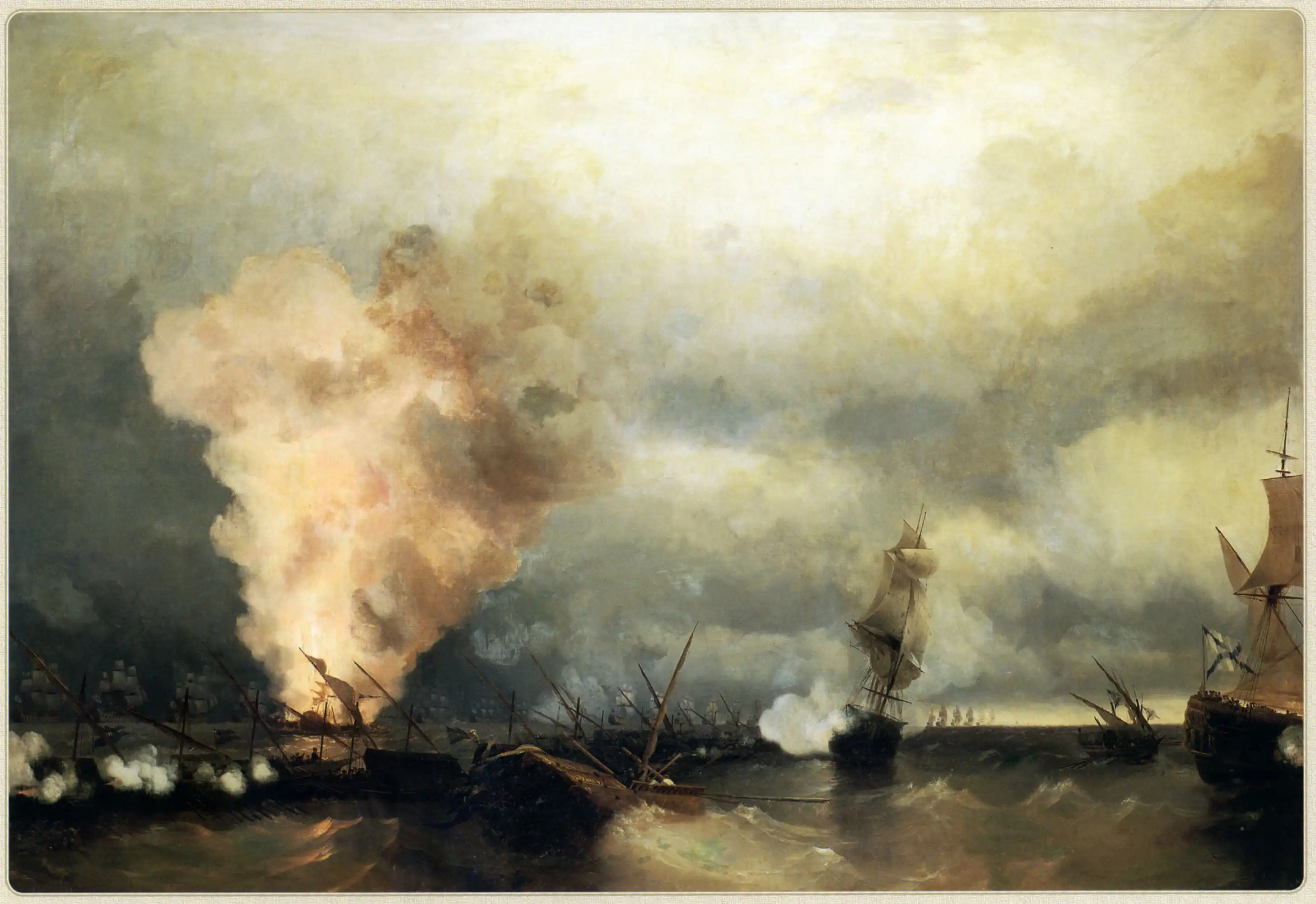 На картине великого мариниста запечатлён эпизод морского сражения в ходе Русско-турецкой войны 1768-1774 годов. Чесменский бой произошёл у турецких берегов в ночь на 26 июня 1770 года. Чтобы отвлечь внимание Турции от действий на Чёрном море, были направлены две эскадры кораблей из Балтийского моря в Средиземное. Под общим командованием генерал-аншефа Орлова находились адмирал Спиридов и контр-адмирал Эльфинстон.