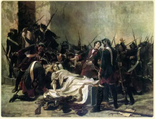 На картине художника – одна из трагических страниц нашей истории: смерть свергнутого императора Ивана Антоновича. На коленях перед убитым стоит подпоручик Смоленского полка Василий Мирович, пытавшийся вызволить его из неволи.