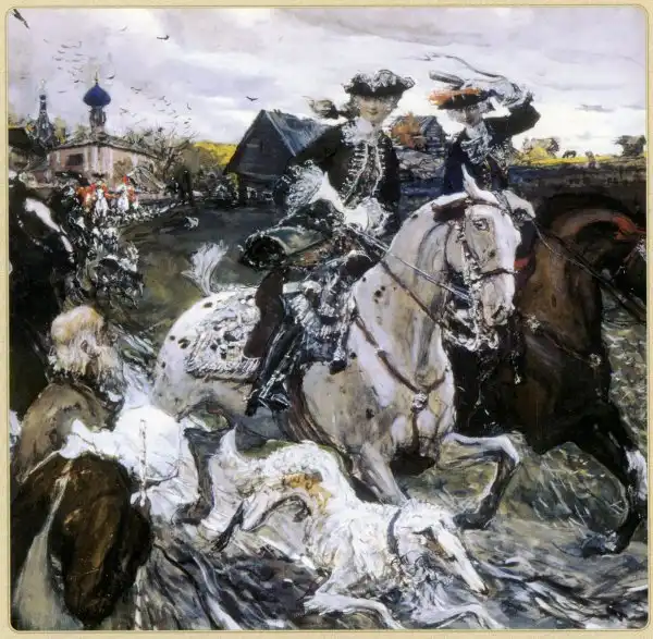 На картине мимо крестьян скачут дочь Петра Великого, Елизавета, и Пётр II: охота с борзыми была их любимой забавой. Скакали по бездорожью. Наедут на кого-то – и жаловаться нельзя: сами виноваты, что с дороги не убрались и угодили под копыта царскому коню!