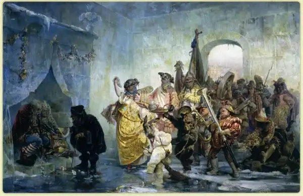 “Молодых” катали на слоне, а за ними ехали “гости” в костюмах всех народов империи. Одни ехали на верблюдах, другие – на оленях, третьи – на собаках, волах, козлах, свиньях… После танцев жениха и невесту повезли в Ледяной дворец, где им предстояло провести ночь. “Молодые” лишь чудом выжили.