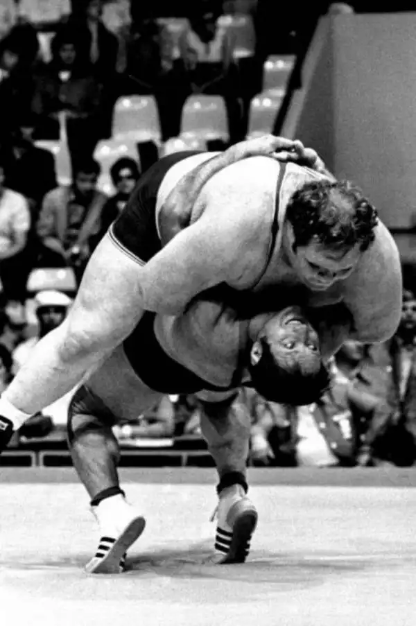 Немец Вильфрид Дитрих весом в 110 кг кидает американца Криса Тейлора (200 кг) на Летних Олимпийских играх 1972 года в Мюнхене. Бросок века.