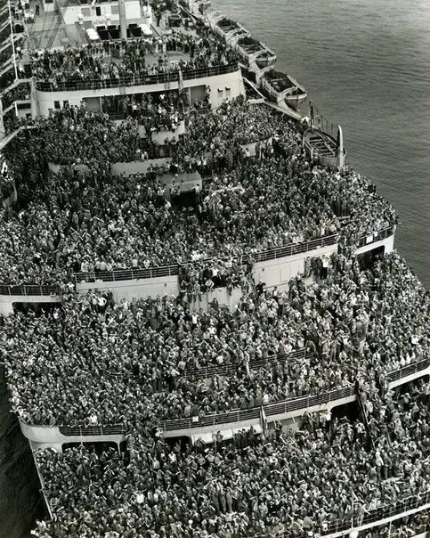 Уникальный кадр корабля «Queen Elizabeth», прибывшего в Нью-Йоркскую гавань в 1945 году с тысячами солдат, вернувшихся со Второй мировой войны