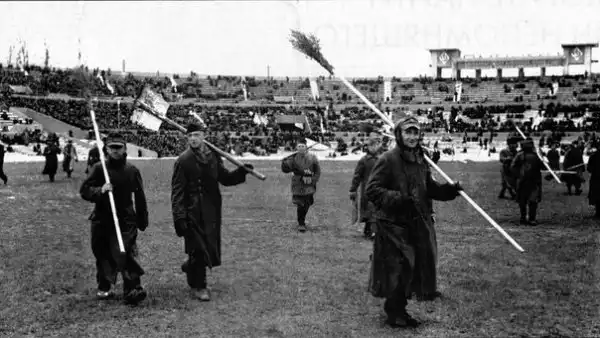 Пленные немцы приводят в порядок футбольное поле в перерыве матча между московским и тбилисским "Динамо", Москва, 1945 год