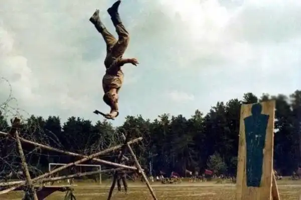 Тренировка советского спецназа. В прыжке с переворотом солдат успевает метнуть топорик в мишень. Уровень профессионализма колоссальный.