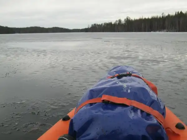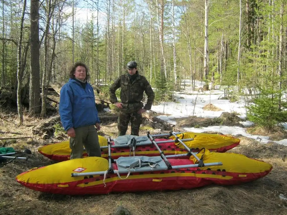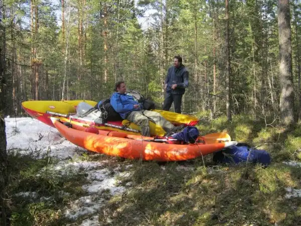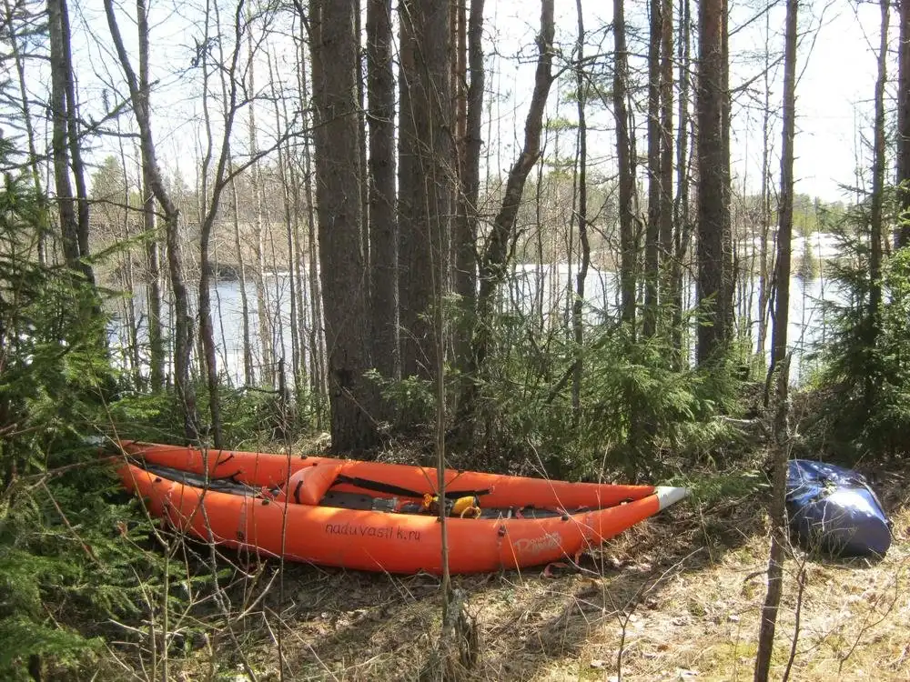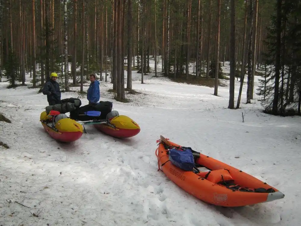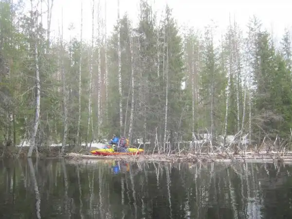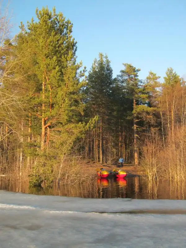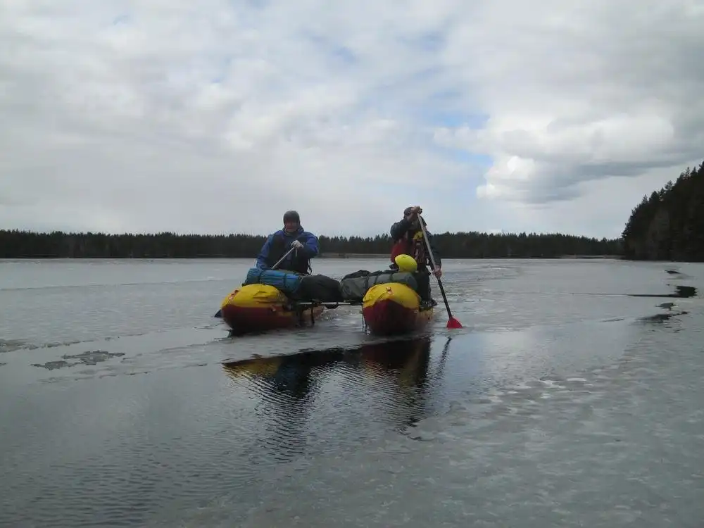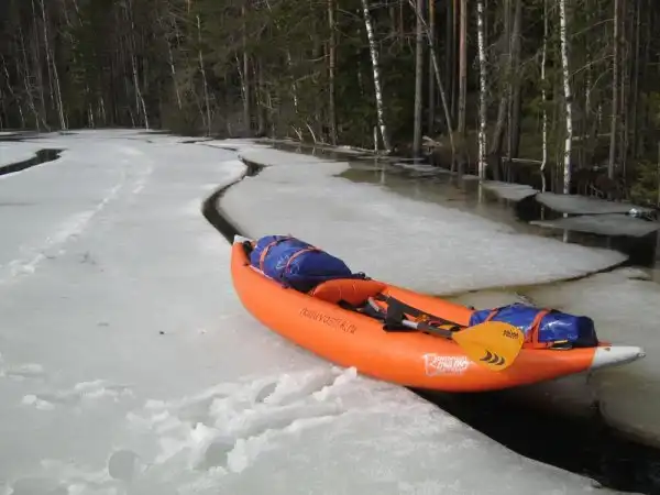 В таких условиях надувной каяк имеет огромное преимущество перед катамараном. Например, можно проехать вплотную к берегу, достаточно воды шириной полметра. Или проползти по трещине шириной в тридцать сантиметров.