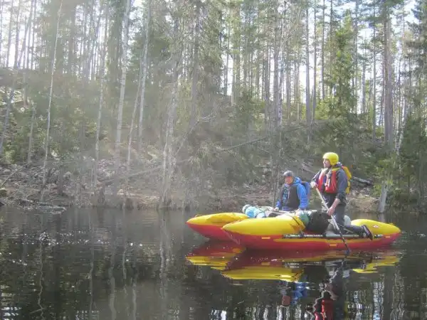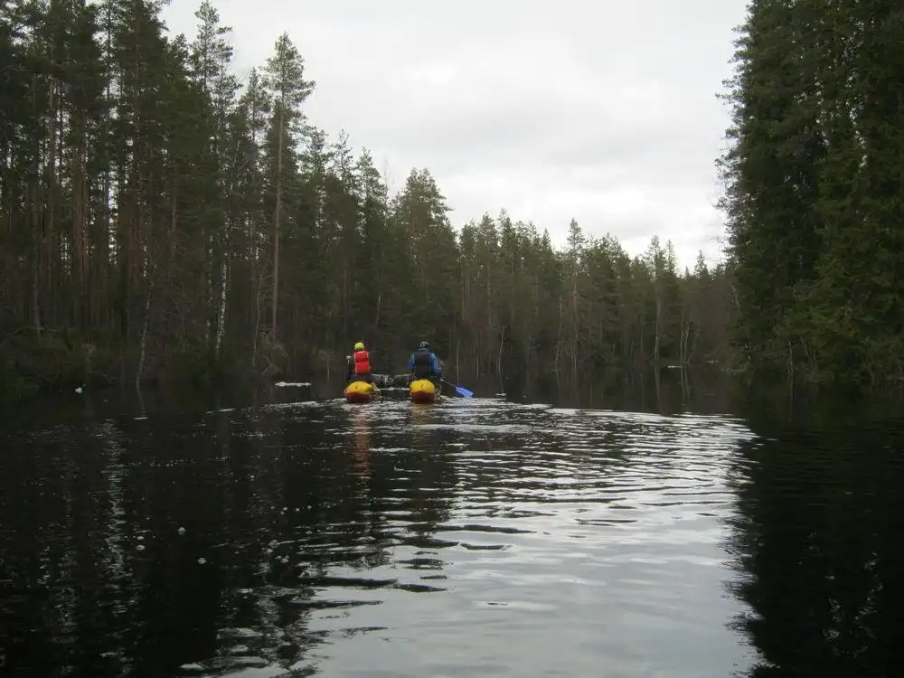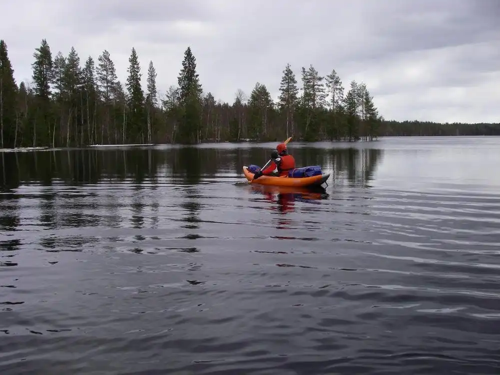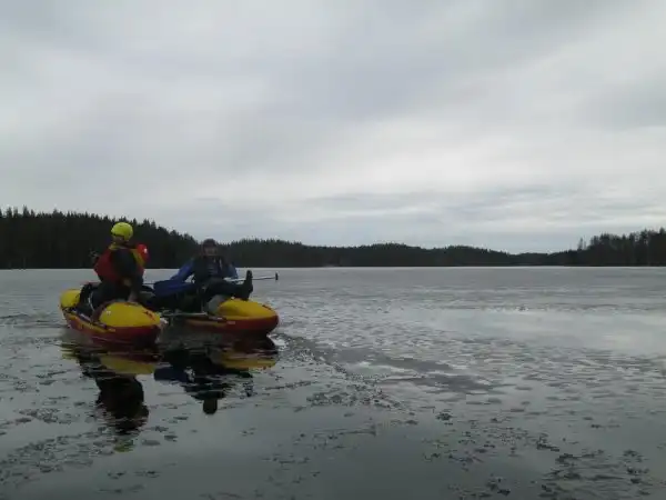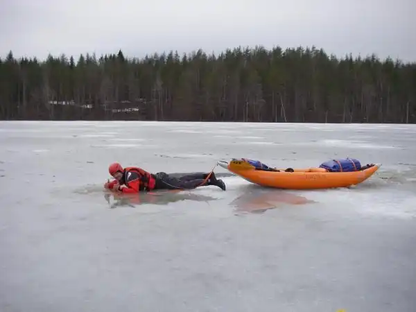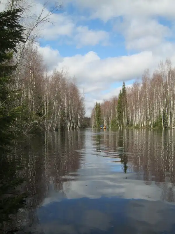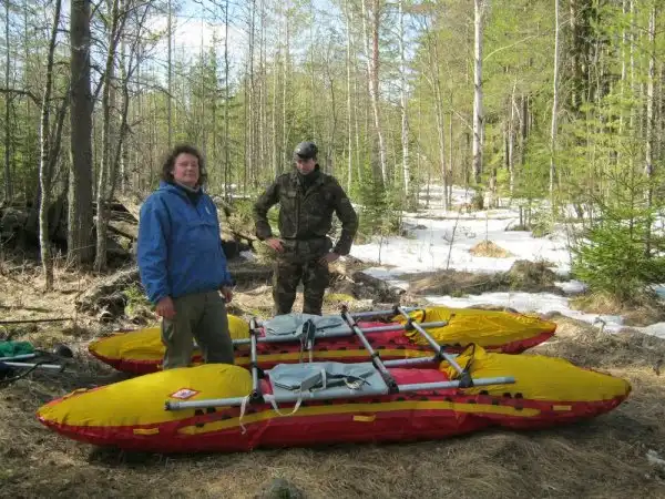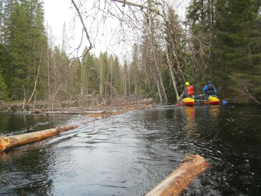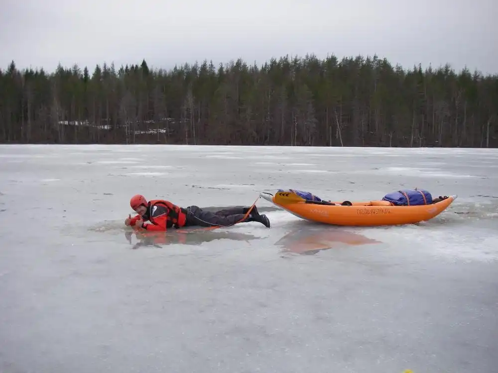 В таких условиях надувной каяк имеет огромное преимущество перед катамараном. Например, можно проехать вплотную к берегу, достаточно воды шириной полметра. Или проползти по трещине шириной в тридцать сантиметров.