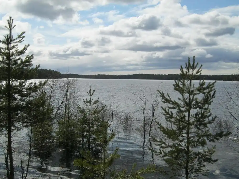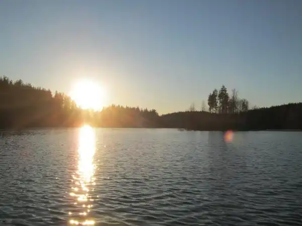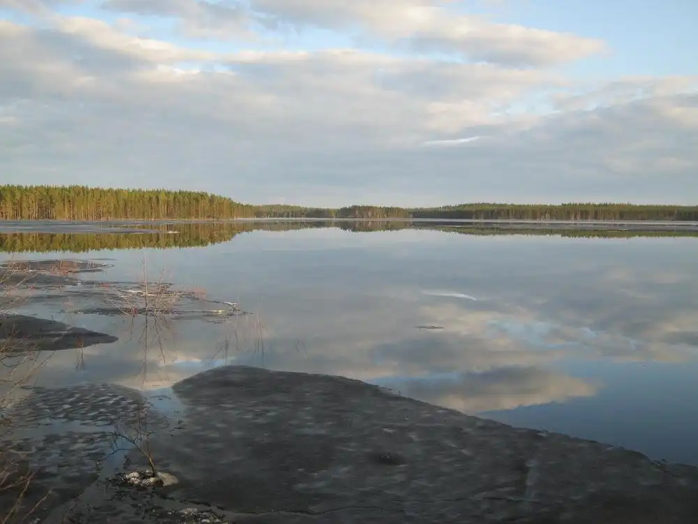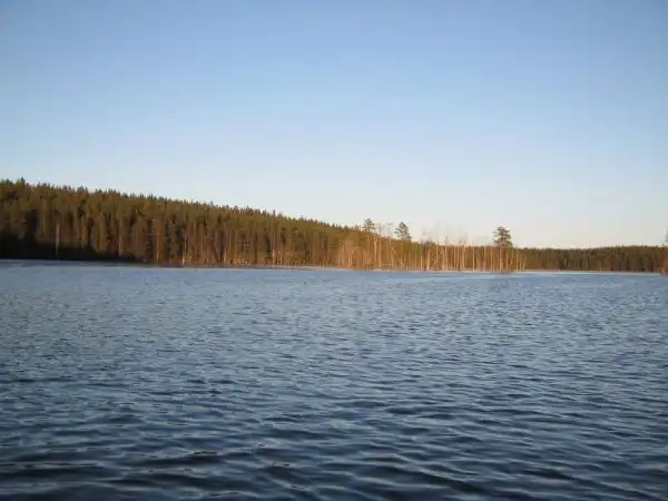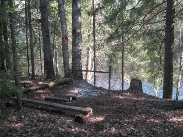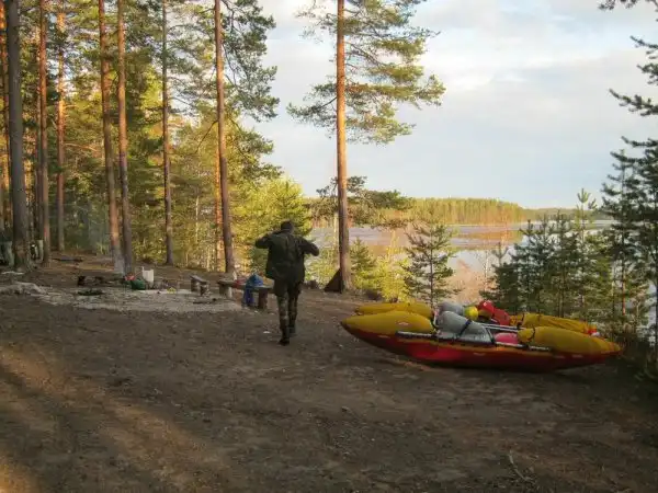 Почти сразу за порогом начинается озеро. Мы немного проехали по нему и встали на стоянку в сосновом лесу на левом берегу.