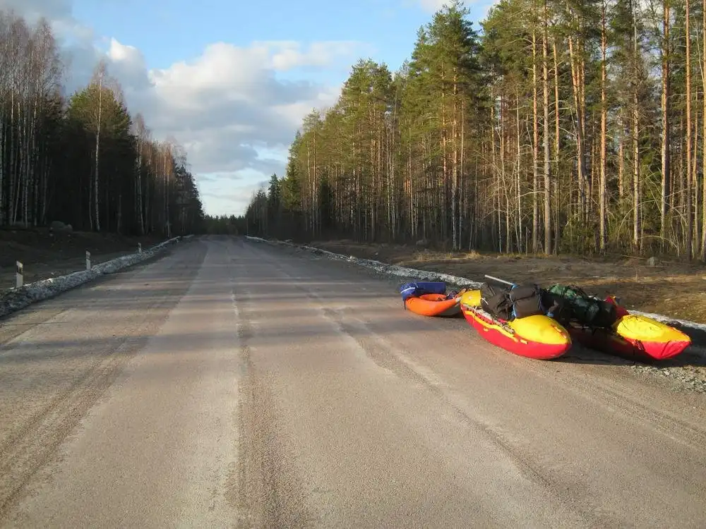 Финальная часть волока проходила по большой автодороге. Снега ни на ней, ни на обочинах уже не было, и все пришлось тащить на себе несколько километров. Мы смогли унести все в одну ходку. Надо сказать, это было жестковато.