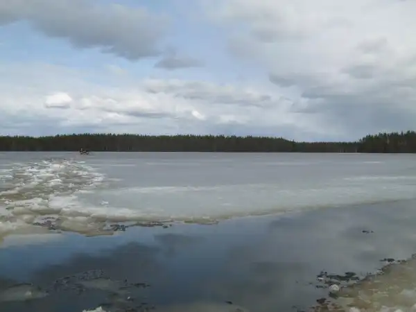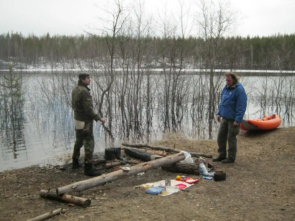 Пока готовили завтрак, к нам подъехали местные рыбачки на моторке. Пообщались немного, они рассказали что пока дальний конец озера заперт льдом. Но мы это итак знали.
