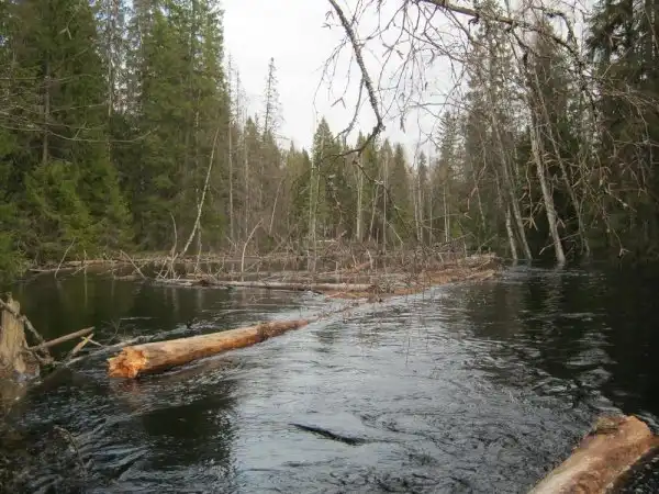 Дождь шел весь день. Река однообразная, шивер мало, плесы, излучины, завалы. Кстати, завалы, встреченные нами на всей реке, для меня (как человека на маленькой и легкой одноместной лодке) не представляли сложности, не требовали много времени или сил, и проезжались быстро и легко. Особенно после Каширки. Их так много на фотографиях, потому что мне приходилось ждать катамаран и я развлекался при помощи фотоаппарата.