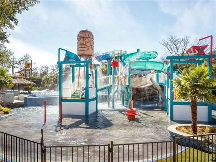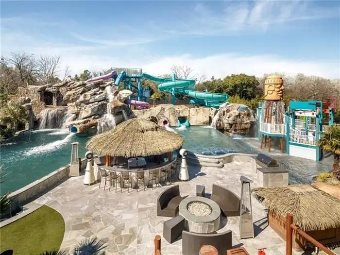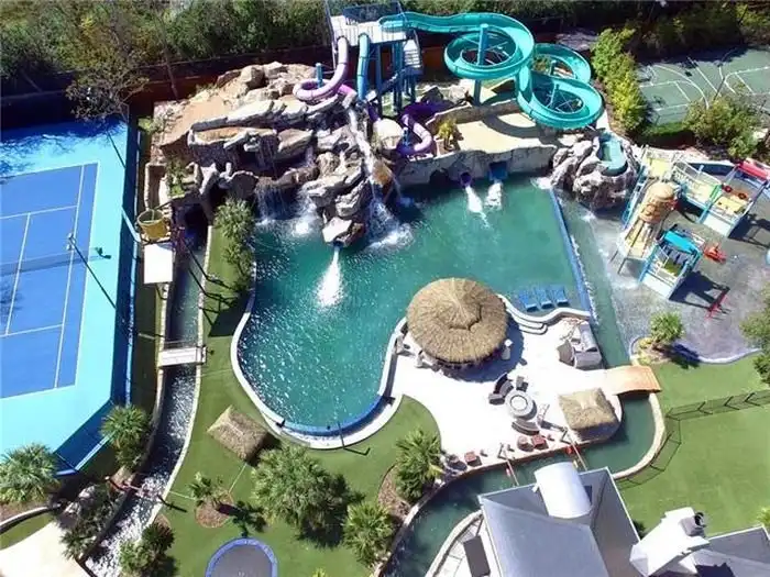На заднем дворе этого дворца, находящегося в Далласе, штат Техас, США, разместили целый аквапарк. Аквапарк состоит из бассейнов, нескольких горок и водопада. Здесь также есть несколько зон для отдыха, большая беседка, качели, теннисный корт, баскетбольная площадка и многое другое, что может развлечь хозяев дома и их гостей.