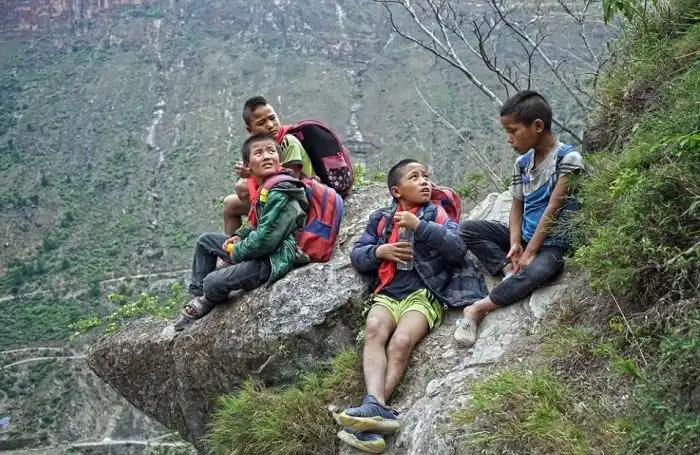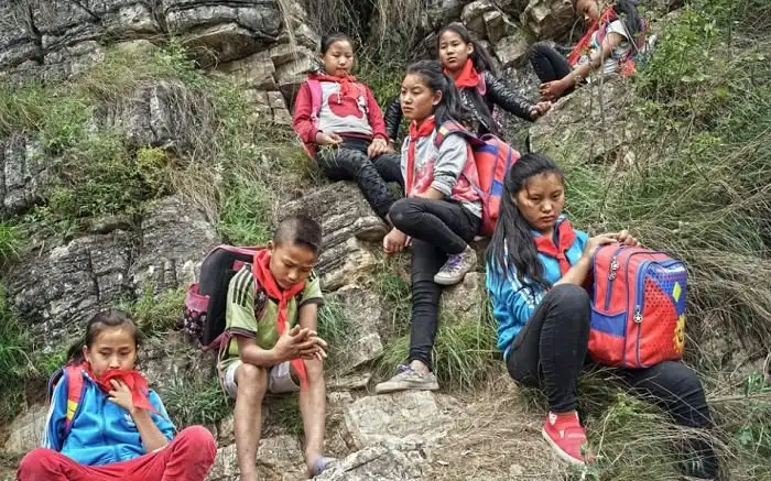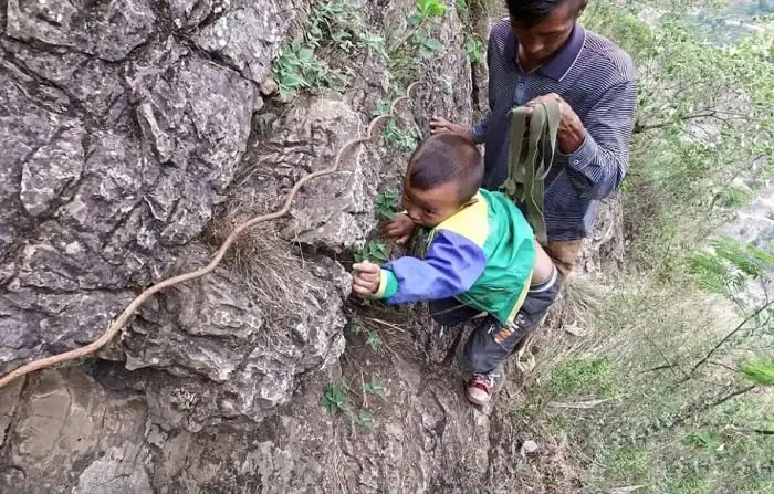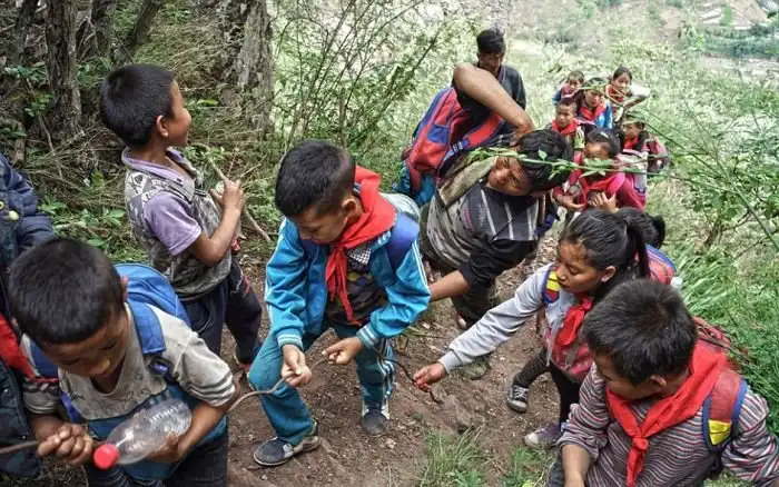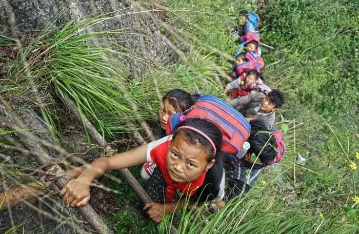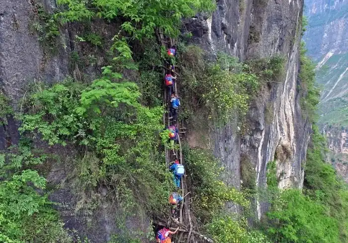 Дети из одной горной китайской деревушки вынуждены каждый день рисковать жизнью, чтобы попасть в школу, которая находится на высоте 800 метров. Дорога в школу занимает 2 часа и пролегает по самодельной лестнице, проложенной прямо через гору. Маленьких детей в школу приводят родители, а вот ребятишкам постарше приходится самостоятельно подниматься и спускаться по ветхой конструкции. Из-за опасного пути в школу далеко не все дети школьного возраста посещают учебное заведение, а чиновники пока лишь разводят руками и говорят, что ничем не могут помочь. Тем временем, уже 8 местных жителей погибли на этой опасной лестнице.