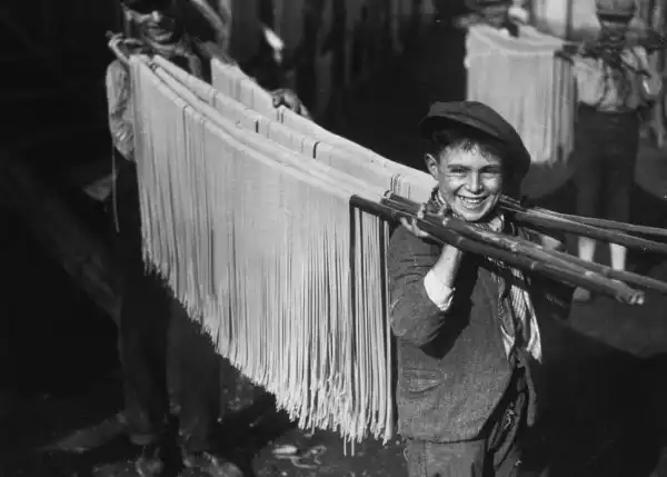 1. Молодые люди сушат на тростниковых шестах свежеприготовленную пасту на одной из макаронных фабрик Неаполя