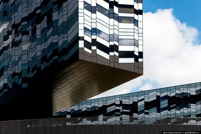 Четыре здания, расположенные на крыше основного здания — это две гостиницы, спортивный комплекс и административное здание.