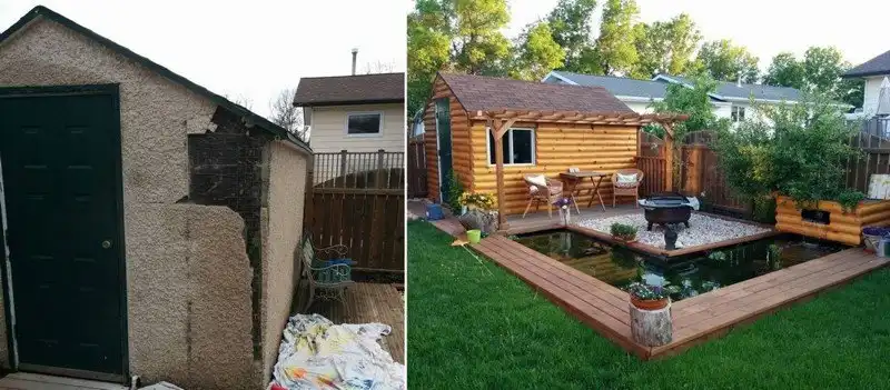 Один парень вместе с отцом решили, что пора придать более презентабельный вид старому сараю во дворе. Они ободрали старую штукатурку, заменили её на современный сайдинг, вырезали окно, сделали зону отдыха с навесом и красивый пруд с небольшим водопадном. Весь процесс преображения вы можете увидеть далее в фотоотчете.