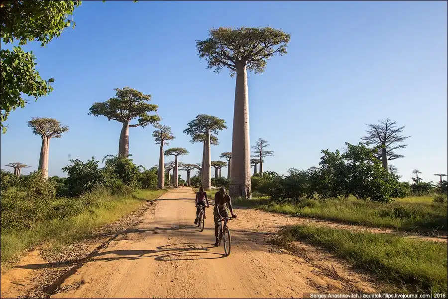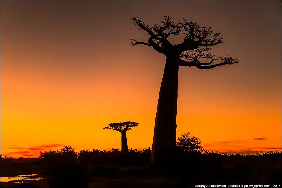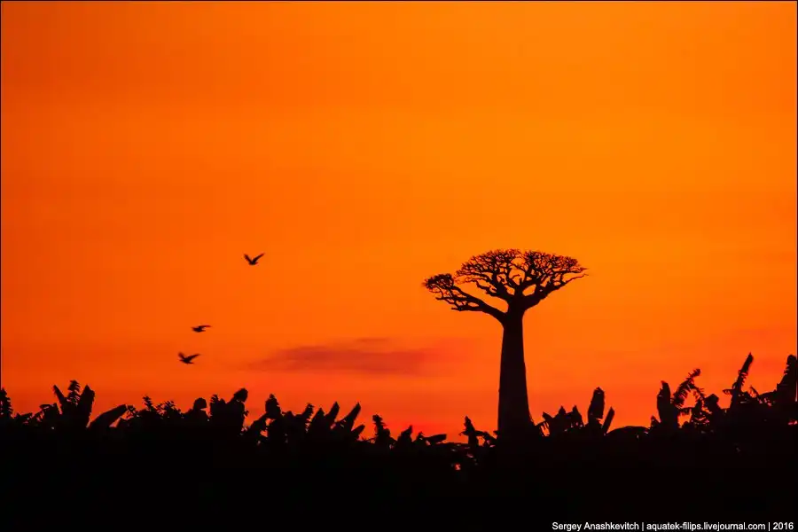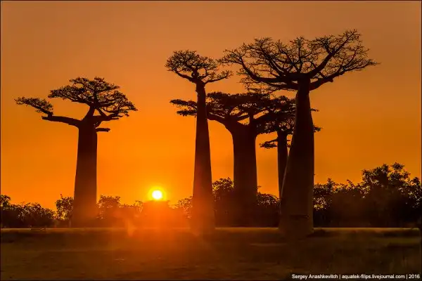 Мы приехали сюда за несколько часов до заката. Едва выбравшись из пыльных джипов, тут же разбежались с жадностью фотографировать, то, к чему добирались на протяжении последней недели путешествия. Нет, конечно, можно было сразу прилететь из Антананариву в Морондаву на самолете, но… мы поступили интереснее. Ехали через деревни на автобусе, три дня сплавлялись по реке Тцирибихина, два дня ехали на джипах по убитым дорогам среди джунглей. И вот… наконец-то баобабы!