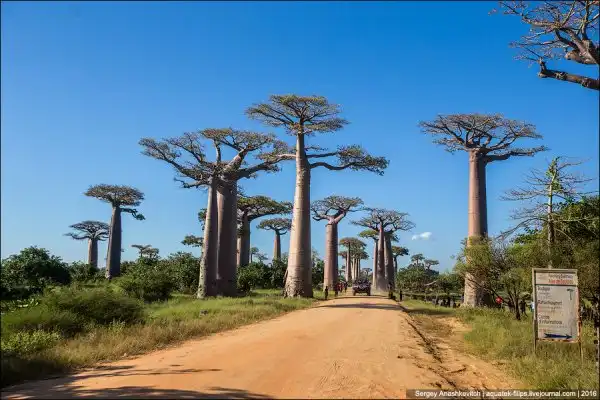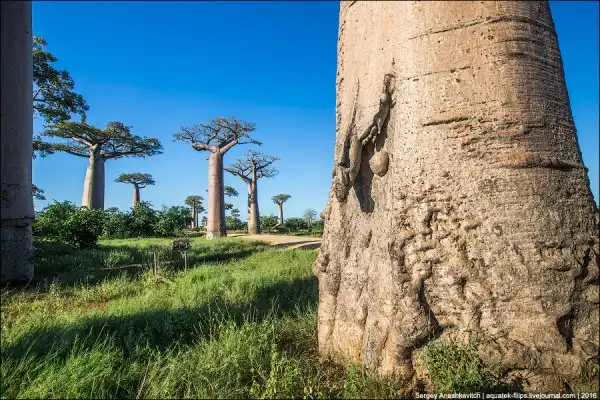 Баобаб, в основном, растет на Мадагаскаре, являясь даже символом острова. В других странах Африке и Австралии есть еще несколько видов баобабов, но такие, похожие на бутылки, растут только здесь. Одним из самых известных мест произрастания этого дерева стала грунтовая дорога между городами Belon’i Tsiribihina и Morondava в регионе Менабе на западе Мадагаскара, которую называют Аллеей Баобабов. Когда-то здесь были густые тропические леса, покрывавшие весь остров, но … человек вырубил значительную их часть, изменив Мадагаскар до неузнаваемости. И лишь баобабы остались возвышаться над теперь уже саваннами.
