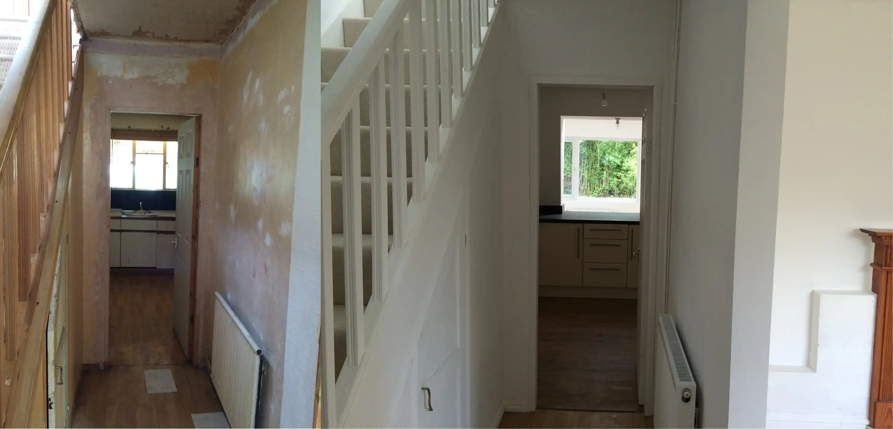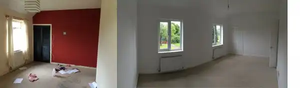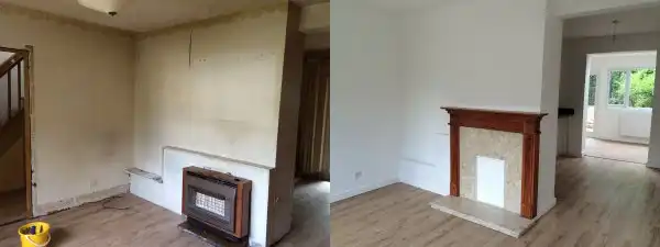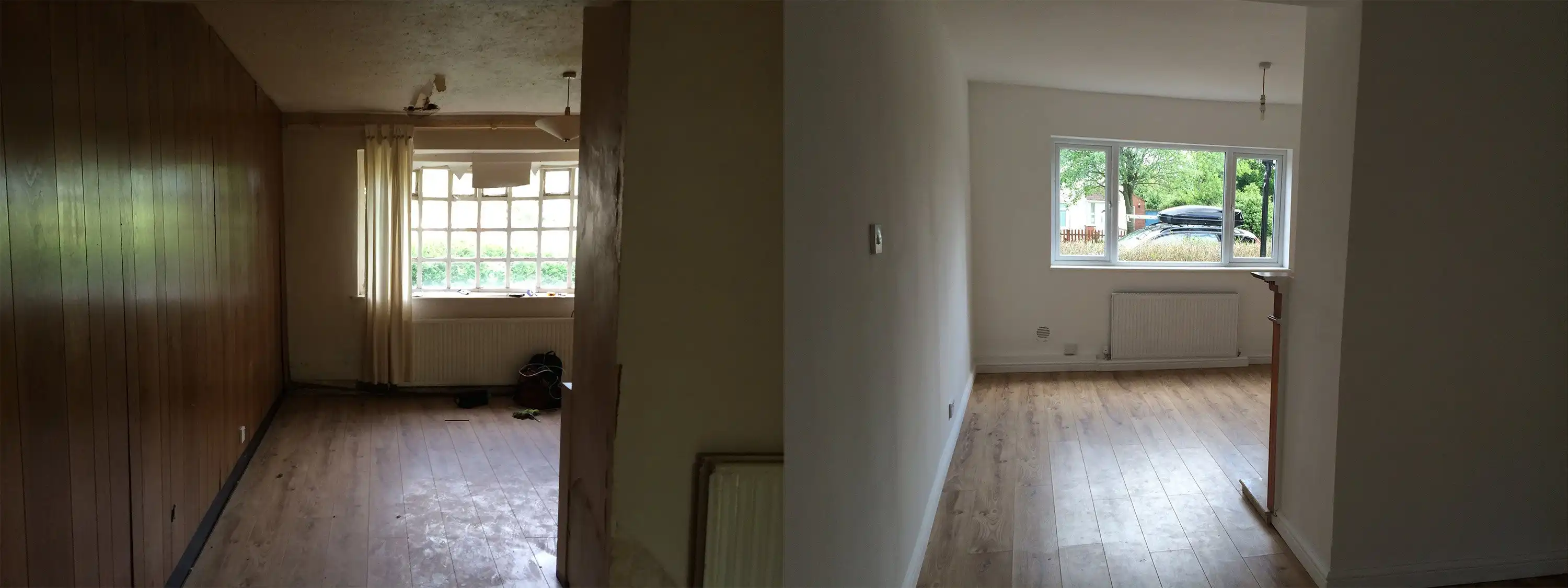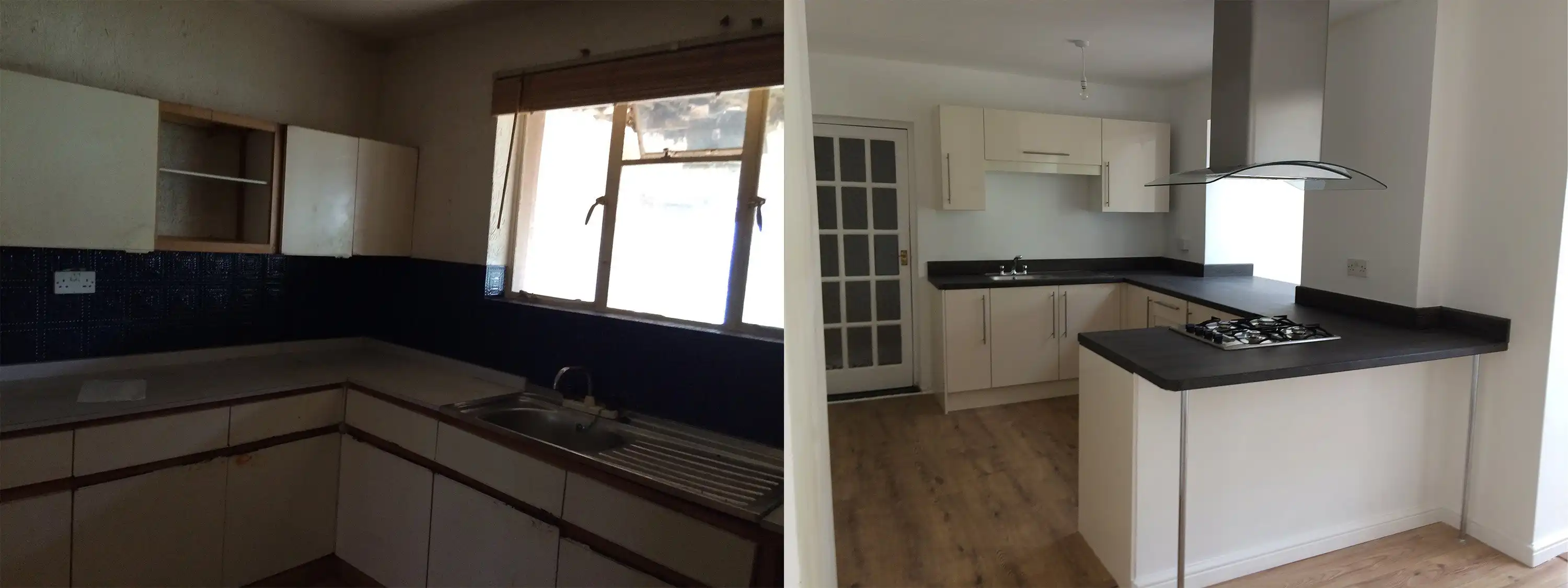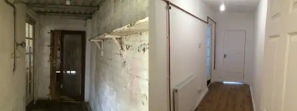 После долгих раздумываний я решил купить заброшенный домик и привести его в божеский вид своими руками. С левой стороны фотографии дома как только я его купил и с права конечный резултат 10 неделной работы.