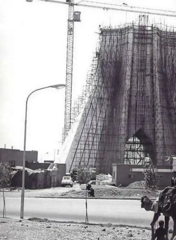 Башня памяти царей в Тегеране (в 1979 году была переименована в Башню Свободы или Башню Азади) во время строительства в 1966 году. Позже памятник стал плотно ассоциироваться с городом, а Фаррох называет её «Эйфелевой башней Тегерана».