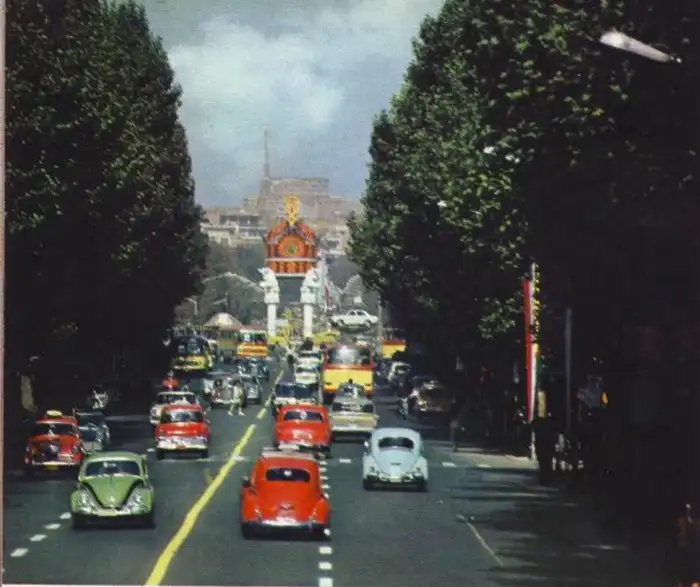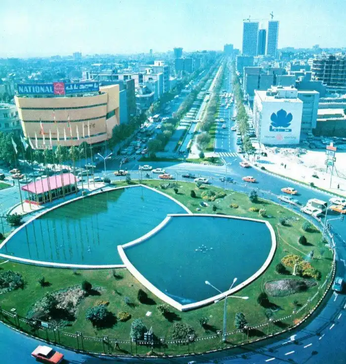 Улица Вали-Аср, которая раньше называлась улицей Пахлеви в честь правящей династии, в 1960 году. Эта улица, окруженная деревьями, является одной из самых оживлённых в Тегеране.