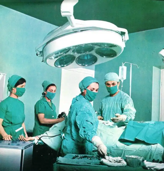 Операционная больницы в Тегеране в 1971 году. К концу правления шаха, 34 миллиона жителей Ирана лечило всего 15000 врачей, что вызывало огромные проблемы с медициной, особенно за пределами таких крупных центров как Тегеран.